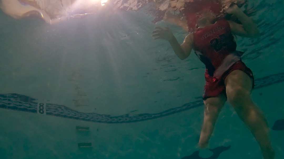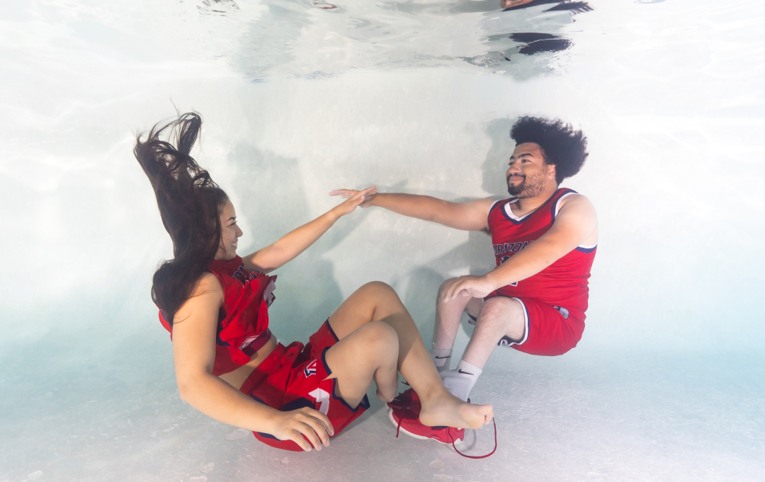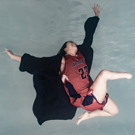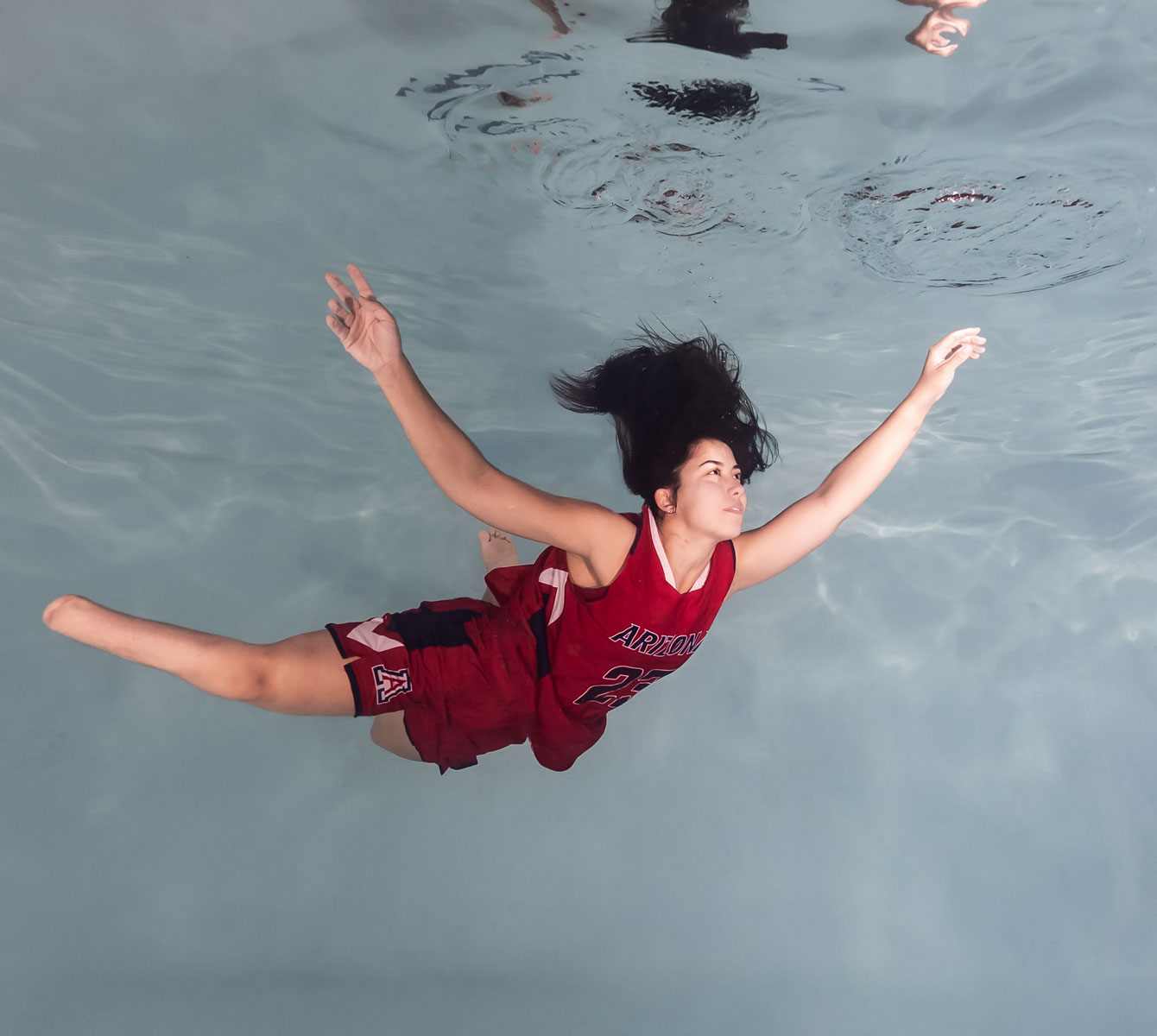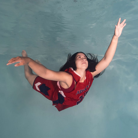 My goal for the photoshoot was to be comfortable in an uncomfortable environment. I love the water, but to be in the water, I have to take my prosthetic off, and not only is it physically sensitive, but it’s also sometimes an insecurity of mine to showcase it front and center. However, I felt that the underwater was such a unique opportunity to showcase all of me at my most vulnerable form while also showcasing my achievements through wearing my basketball jersey and a graduation gown, which I would consider as more of the side of myself I like to show more.